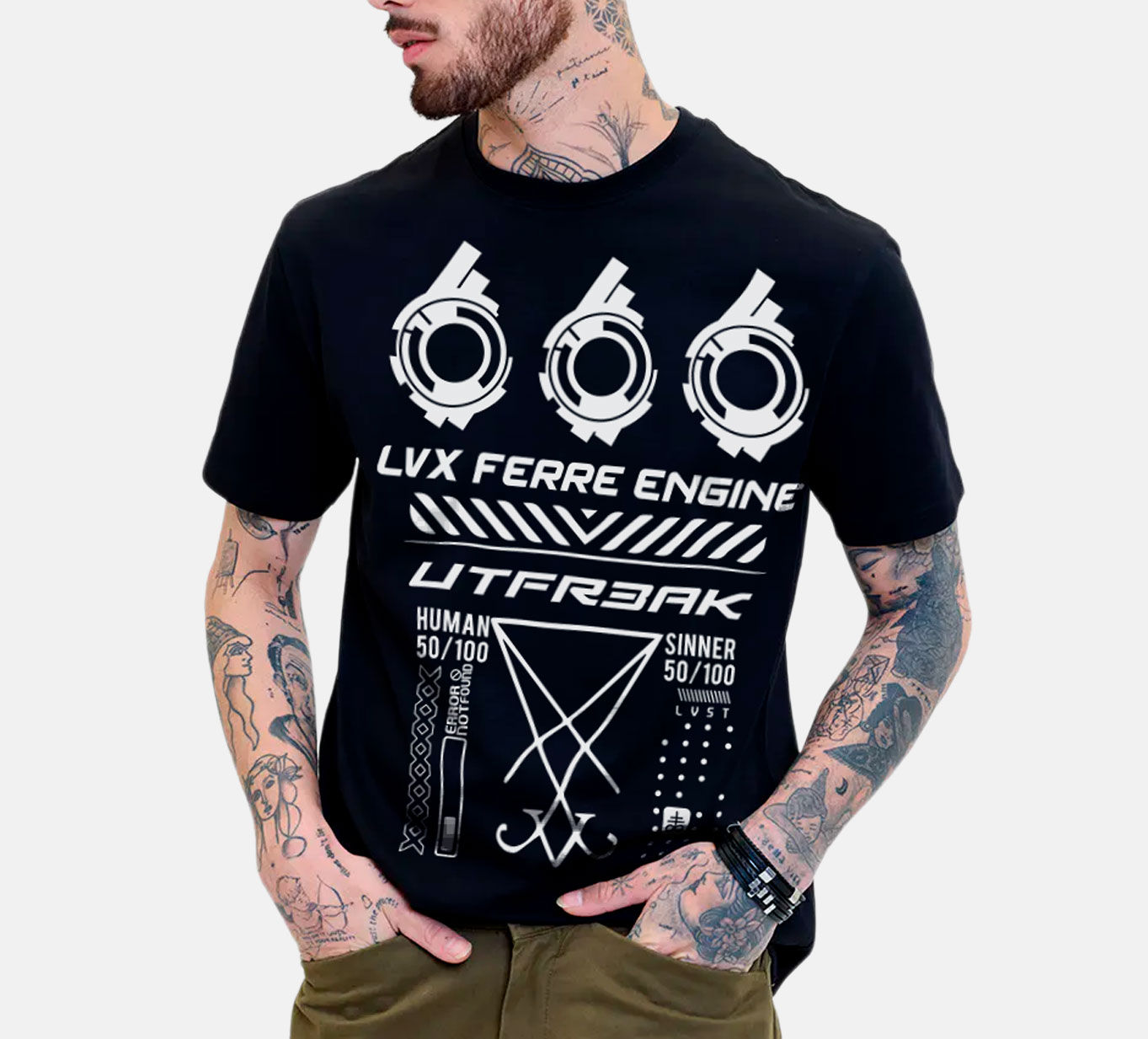 Lux Ferre significa "El Portador de la Luz". En un mundo ciego que sigue a las masas, ser el portador de tu propia luz es el mayor acto de herejía. Esta pieza no fue creada para los que buscan encajar; es el uniforme de los pecadores urbanos, los que cuestionan los dogmas y caminan por el asfalto bajo sus propias reglas. Al fusionar el misticismo gótico con la estética cruda y futurista, hemos diseñado una camiseta que no es moda, es una declaración absoluta de poder e individualidad.